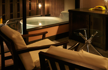 和モダンベッドルームに露天風呂を設けて、斬新な行動派癒し空間をリリースいたしました。情報収集・エンタティメント・ヘルスヒーリング・・・・ 様々な文化の融合を欲張ってお楽しみください。当館のお風呂に用いられている陶器はラジウム鉱石を含んでおりα波によるマイナスイオンが大量に放出され美肌・健康促進効果にたいへん優れております。